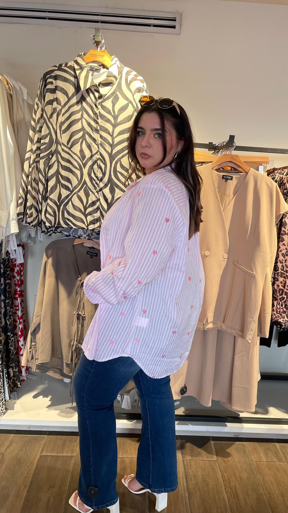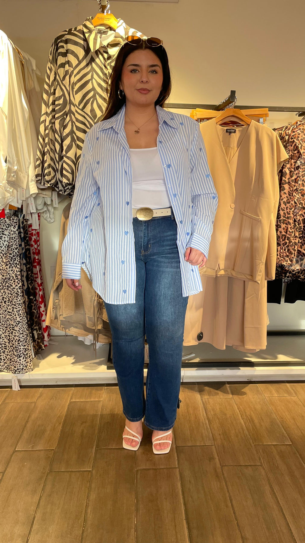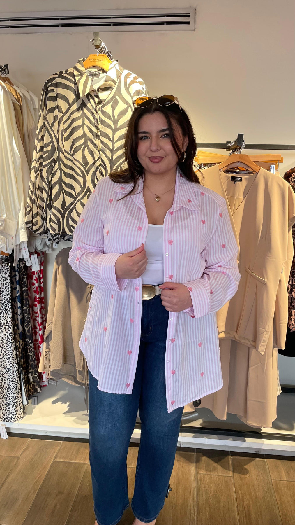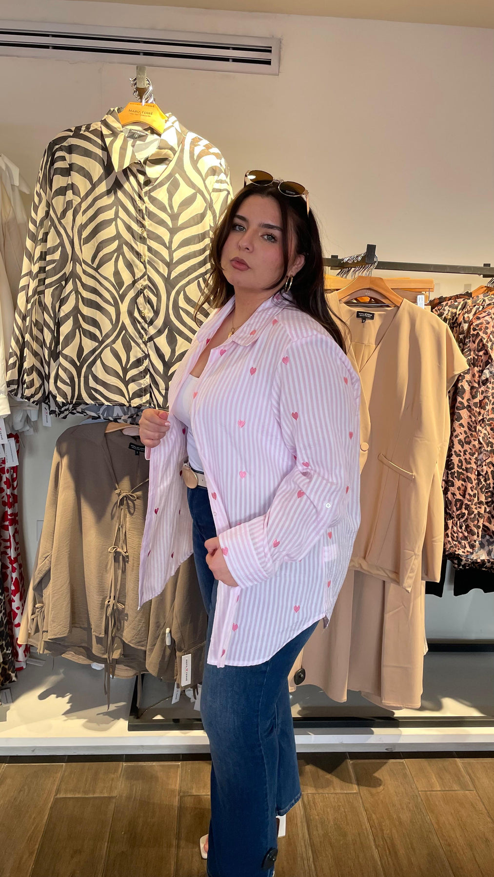 Blusa camisera de linea con diseño de corazones bordados por toda la blusa, dándole un toque súper cool y de fiesta, modelo manga larga, cuello mao clásico, tela súper padre con nivel de stretch de medio a alto.