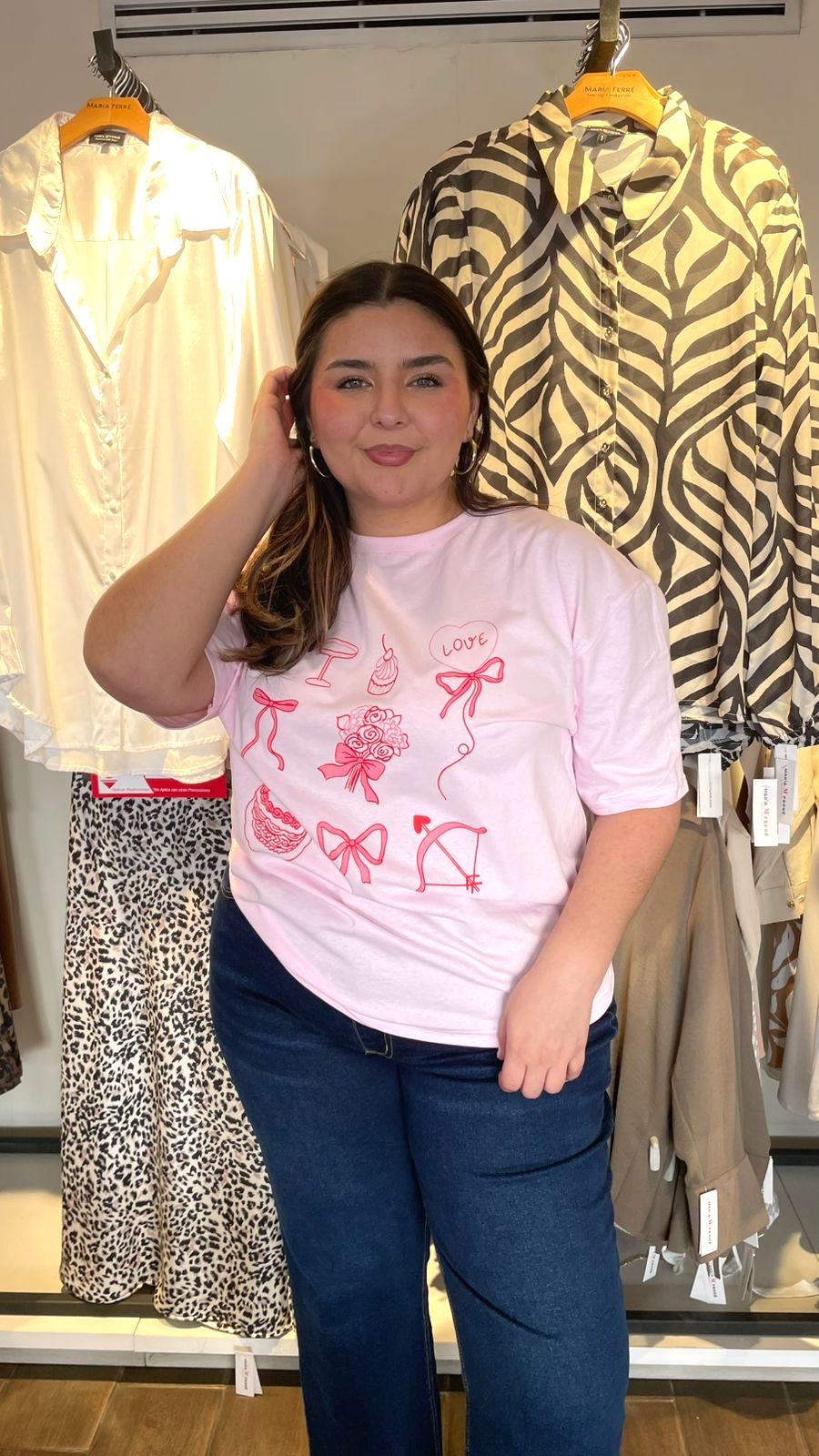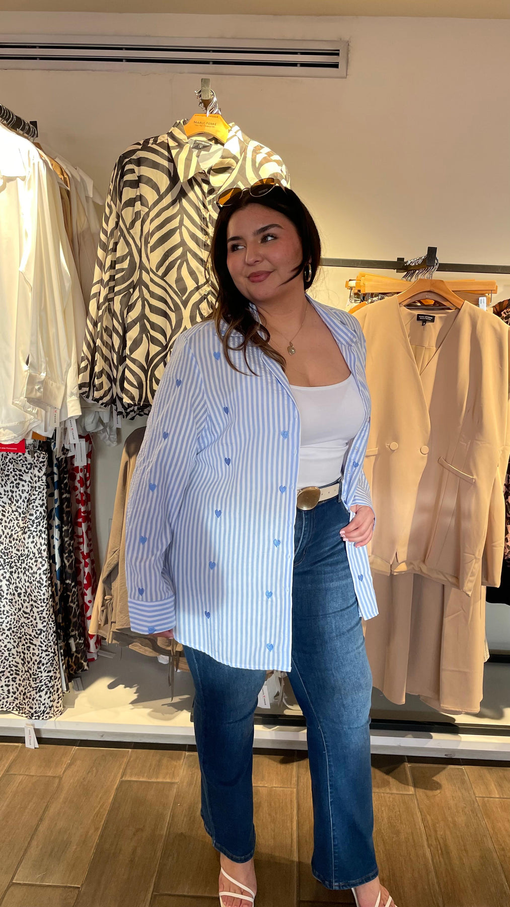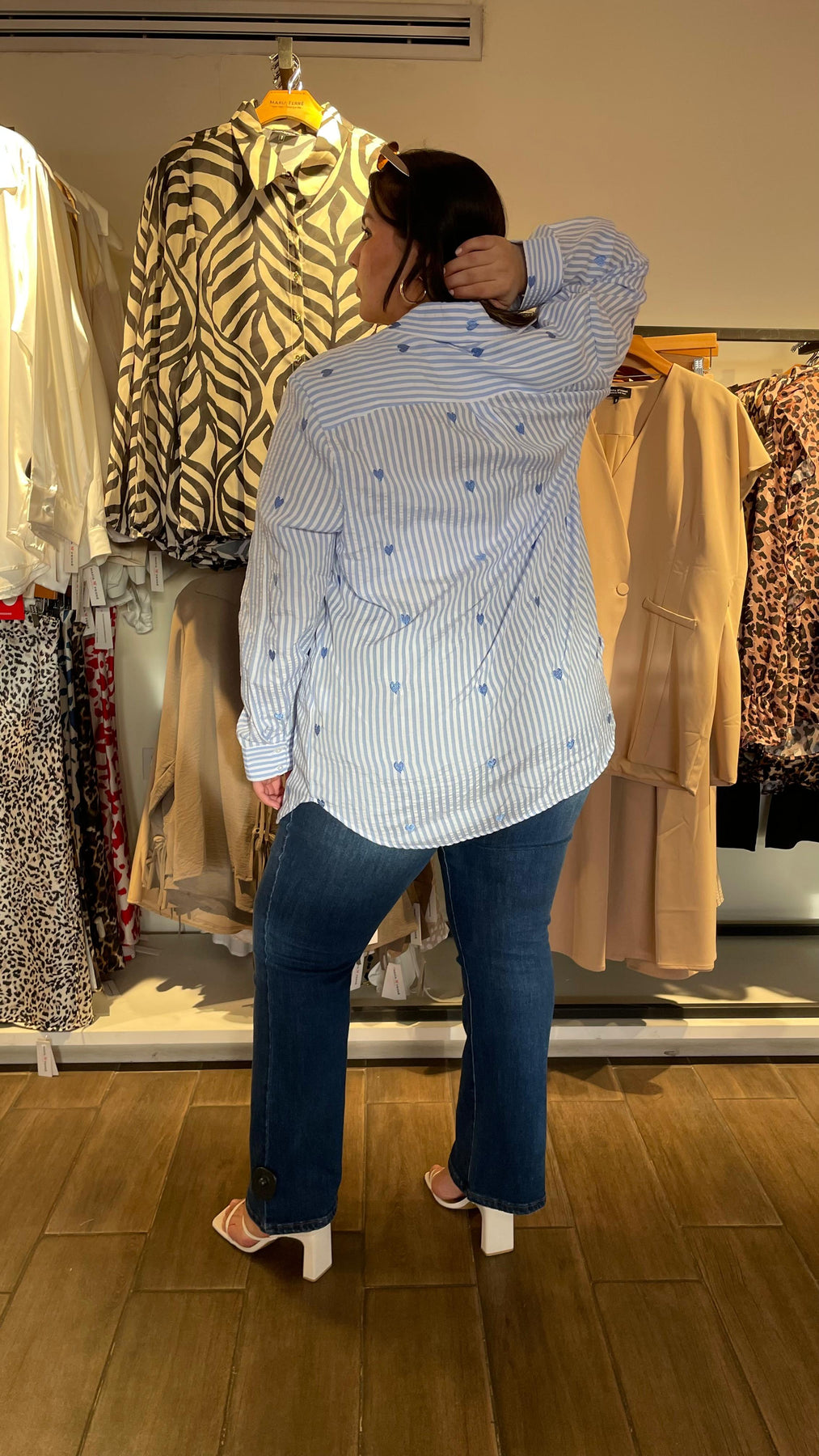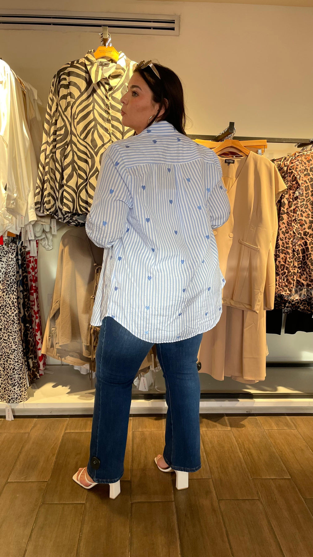 Blusa camisera de linea con diseño de corazones bordados por toda la blusa, dándole un toque súper cool y de fiesta, modelo manga larga, cuello mao clásico, tela súper padre con nivel de stretch de medio a alto.