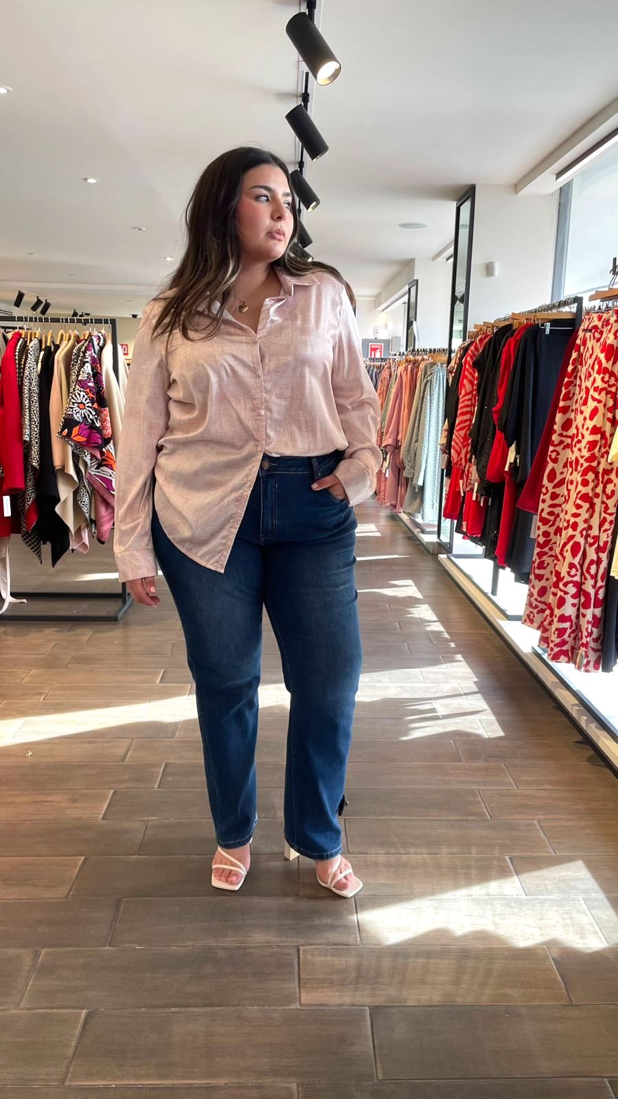 Blusa camisera de tela satin, modelo manga larga con botones forrados de misma tela, estilo camisa de botones. Ideal para usarse en conjunto con pantalón de vestir, en compañía de unos SÚPER JEANS o como sobre camisa.