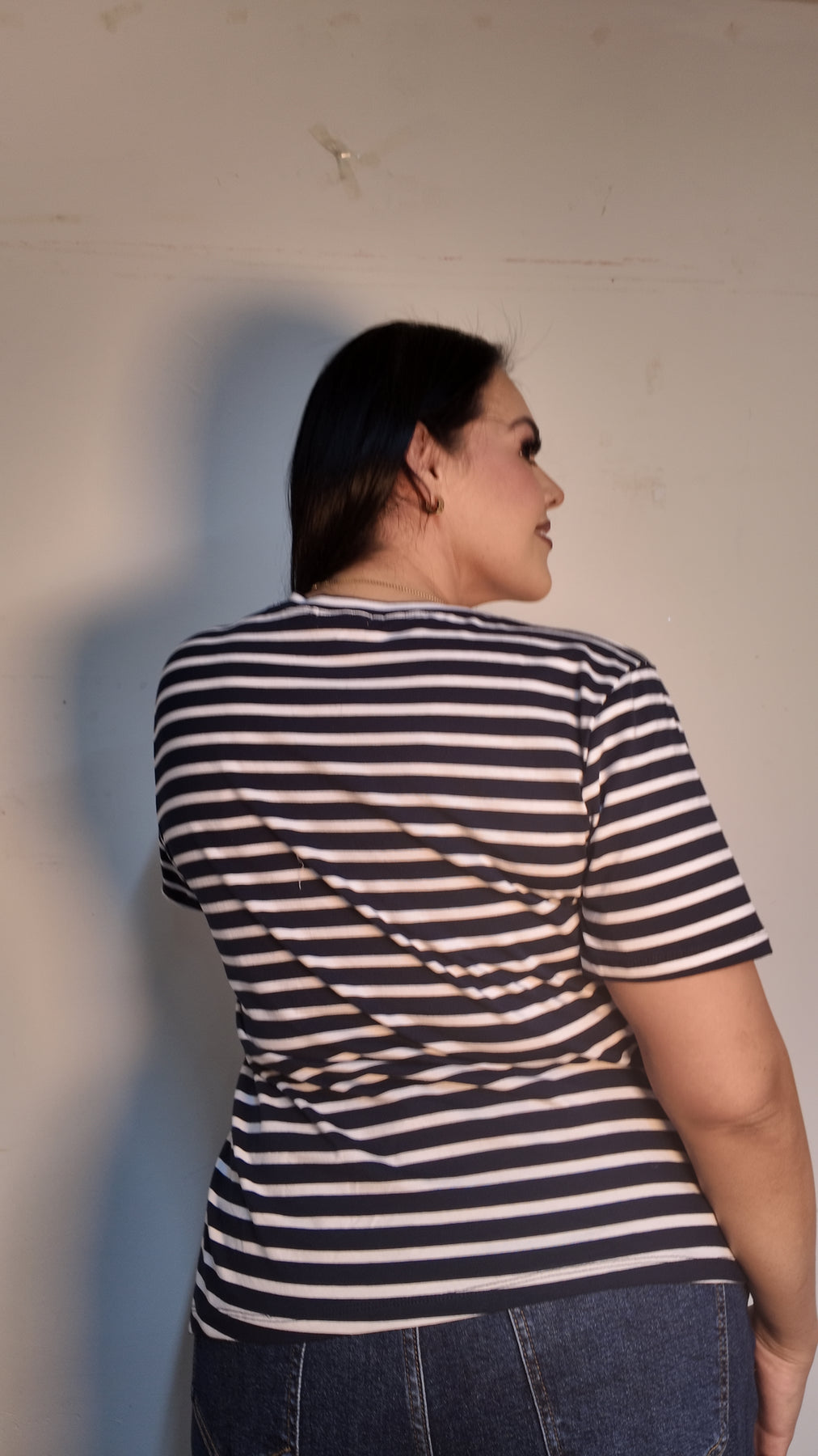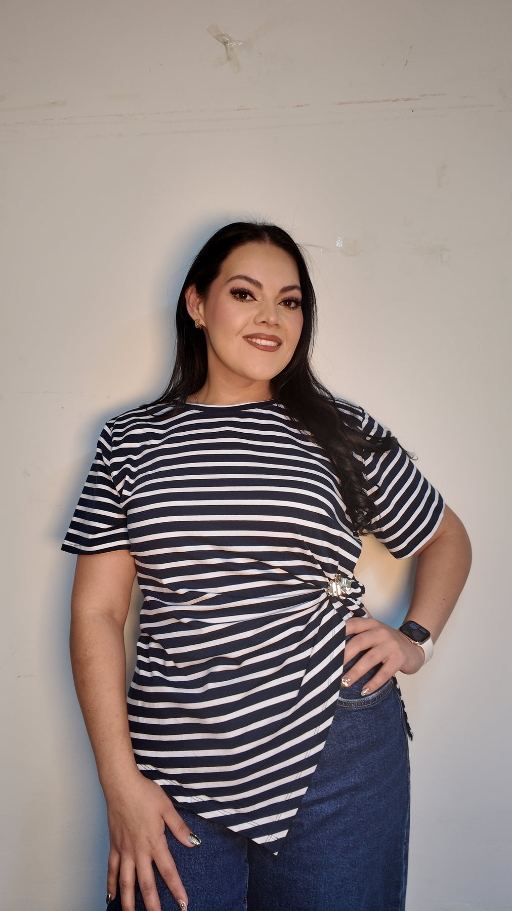 Blusa de manga corta en líneas azul marino y blanco con detalle de hebilla al costado tipo nudo le da un toque original y favorecedor, tela tipo camiseta super strech Ideal para combinar con jeans, pantalones blancos o faldas.