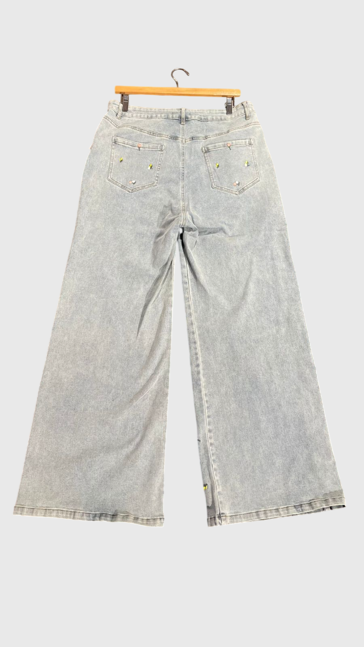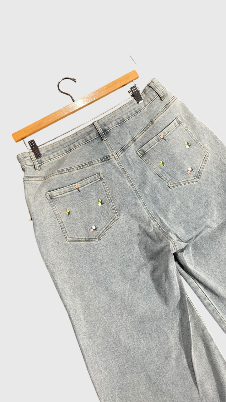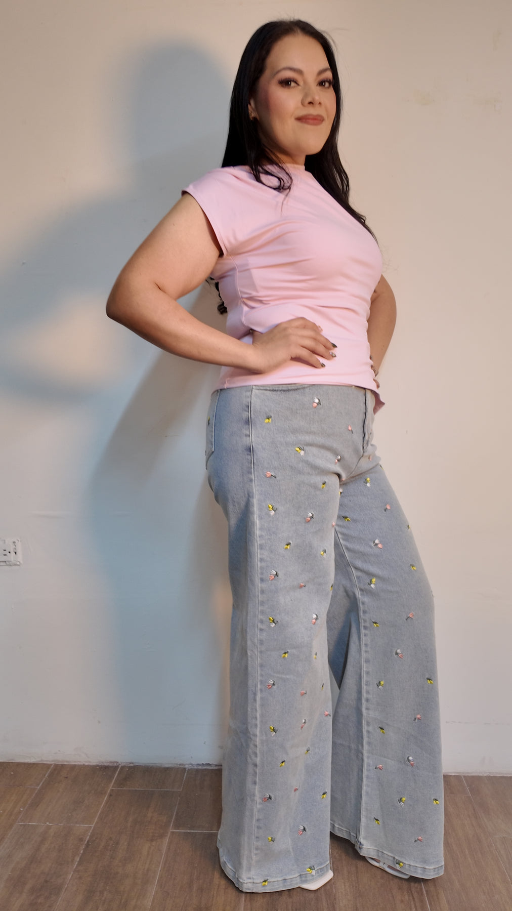 Jeans corte wide con diseño con efecto deslavado y bordado de flores en la parte de enfrente y bolsas traseras, modelo hasta los tobillos, estilo en con nivel de stretch de medio a alto. Prenda ideal para lucir un outfit SÚPER COOL.