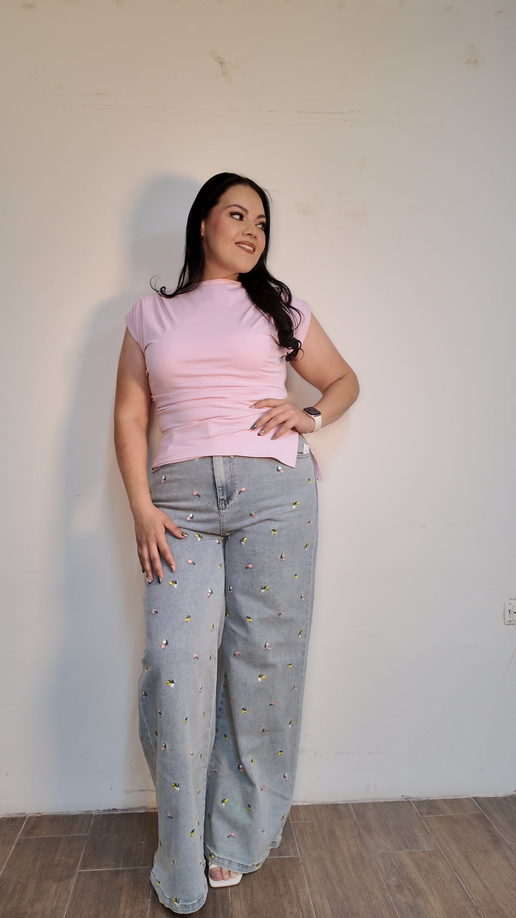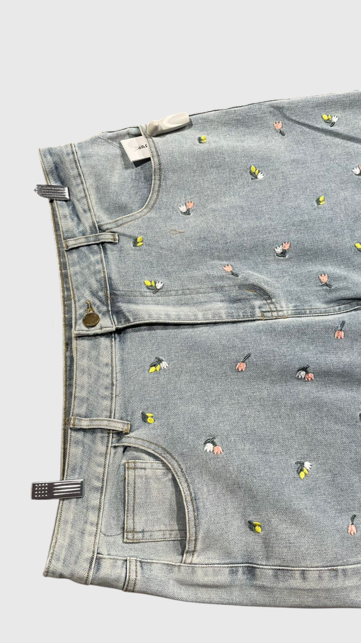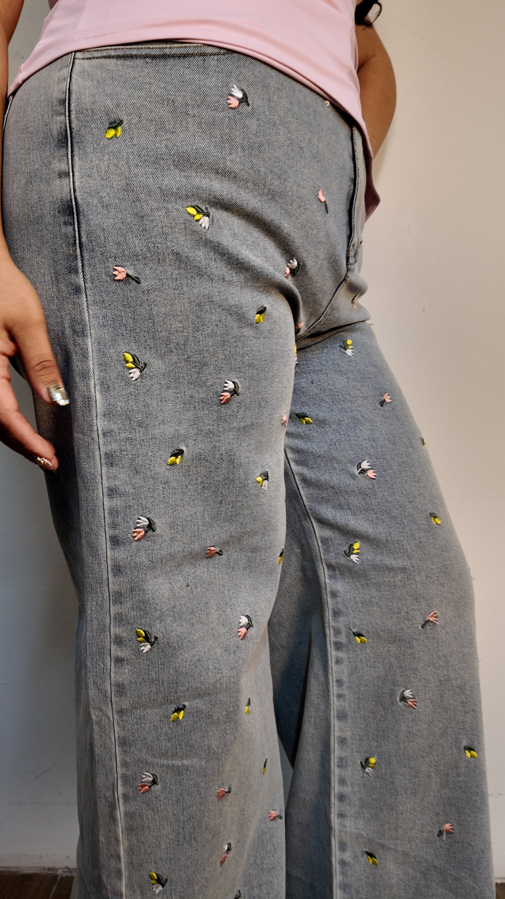 Jeans corte wide con diseño con efecto deslavado y bordado de flores en la parte de enfrente y bolsas traseras, modelo hasta los tobillos, estilo en con nivel de stretch de medio a alto. Prenda ideal para lucir un outfit SÚPER COOL.