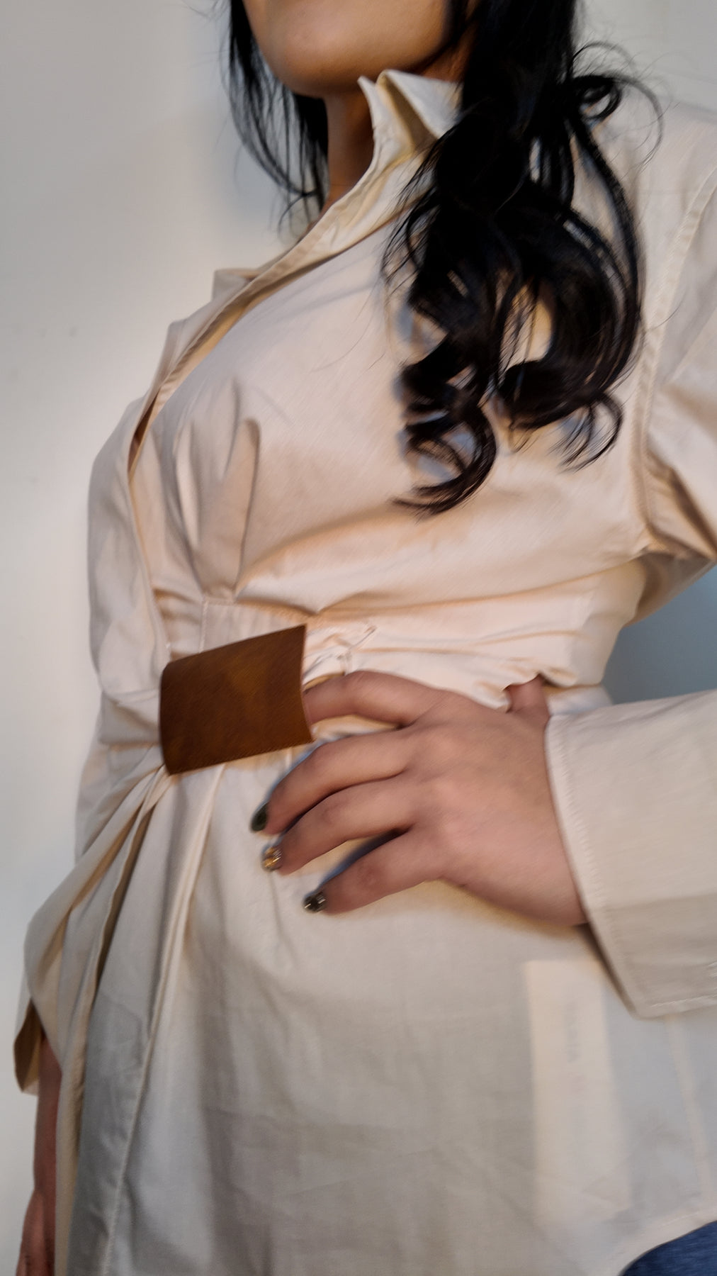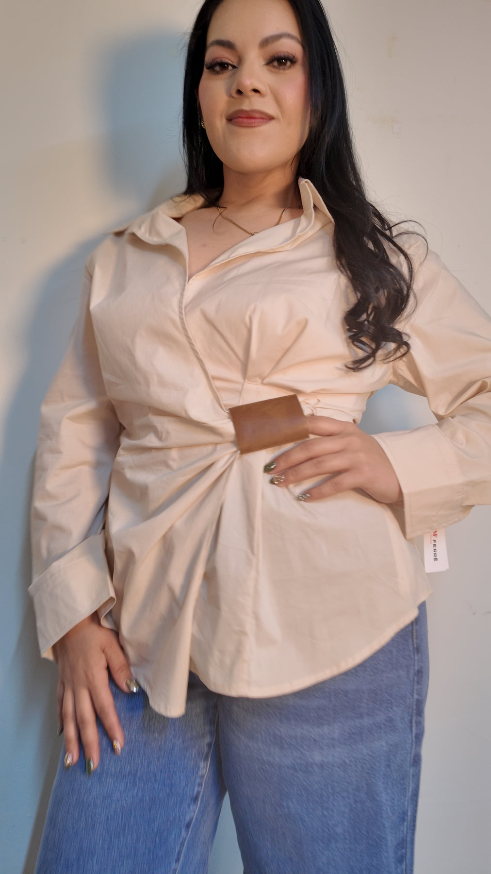 Blusa de manga larga con diseño cruzado y escote en V tipo camisera con detalle de hebilla de piel color café y cuello mao super cool perfecto para combinarse con un que realza el diseño y marca la diferencia.