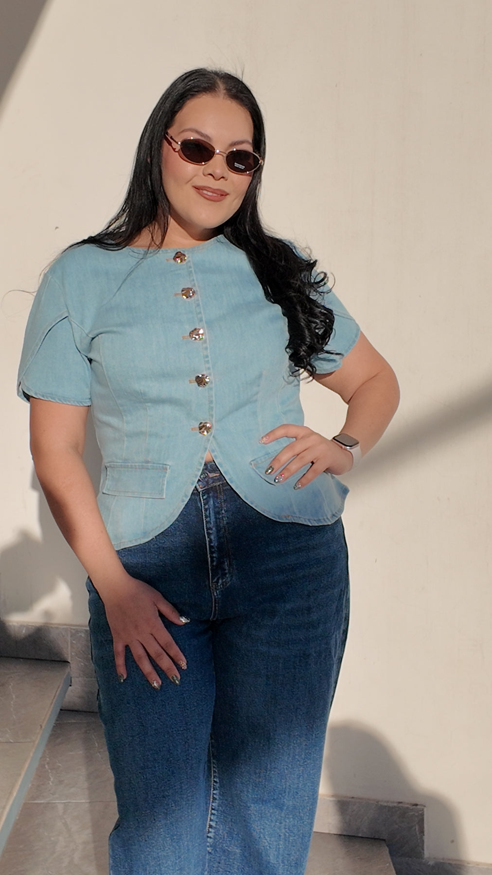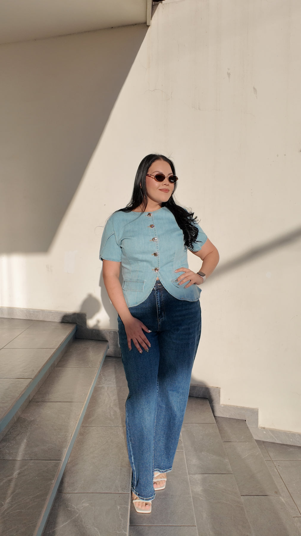Blusa estilo camisera de mezclilla con bolsas al frente tela cómoda diseño de manga corta la hace fresca y cómoda con botones dorados al frenre ideal para cualquier temporada.