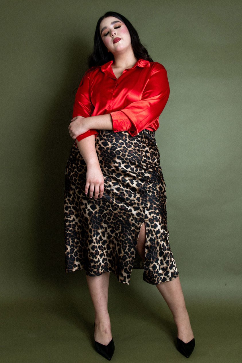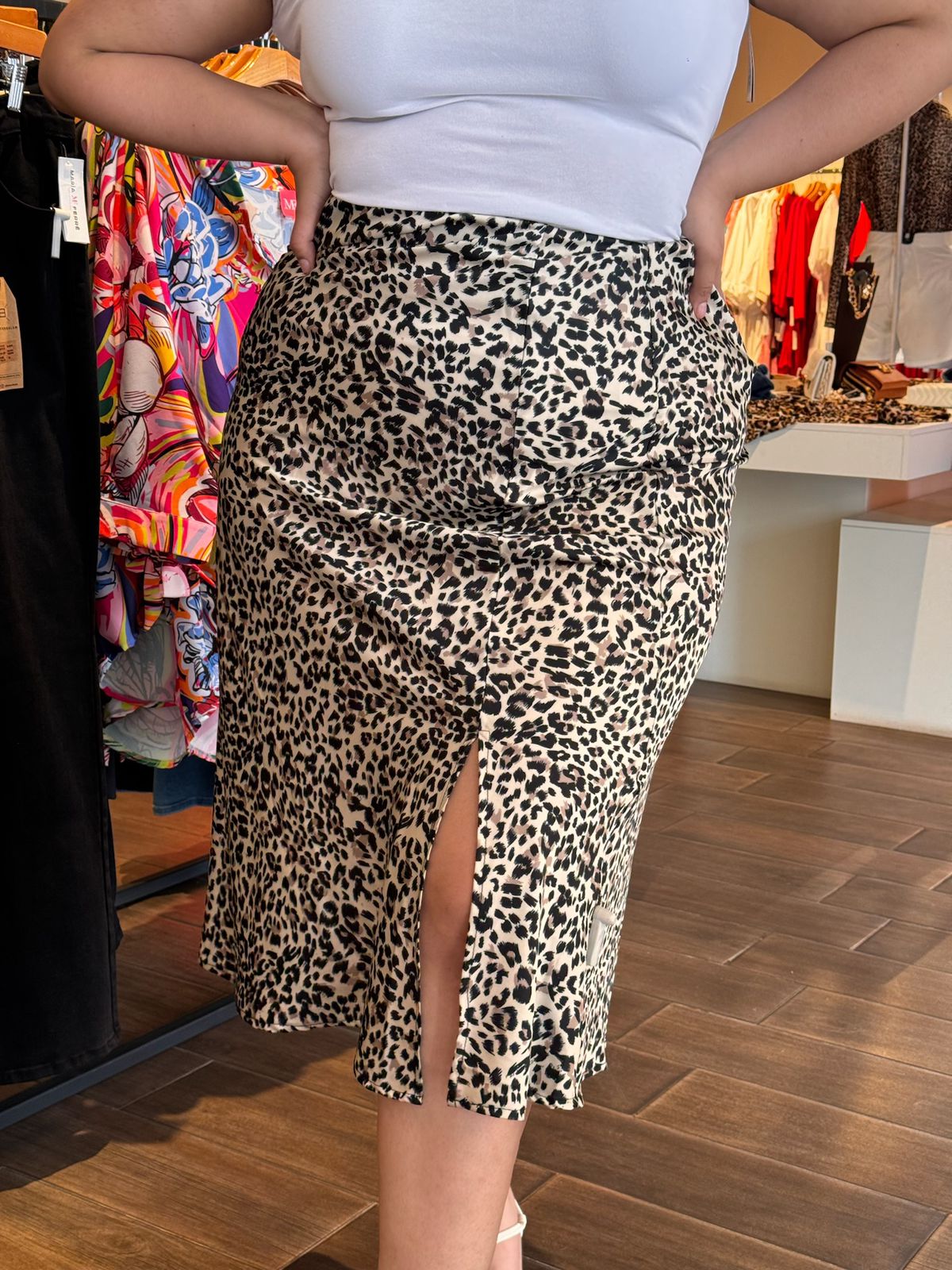 Falda en tela satinada, modelo en estampado animal print con elástico en la parte de la cintura y abertura en la pierna izquierda, súper cómoda ideal para hacerte lucir FABULOSA.