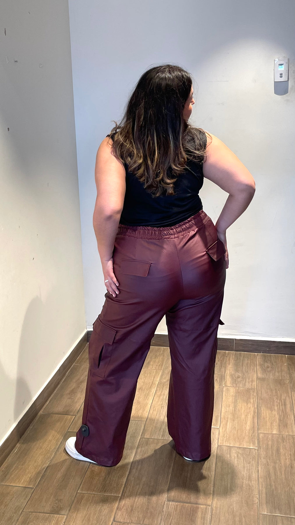 Pantalón cargo liso, modelo hasta los tobillos, estilo tiro alto, con nivel de stretch de medio a alto EFECTO VINIPIEL, modelo con bolsas a los lados, cierre y botón.