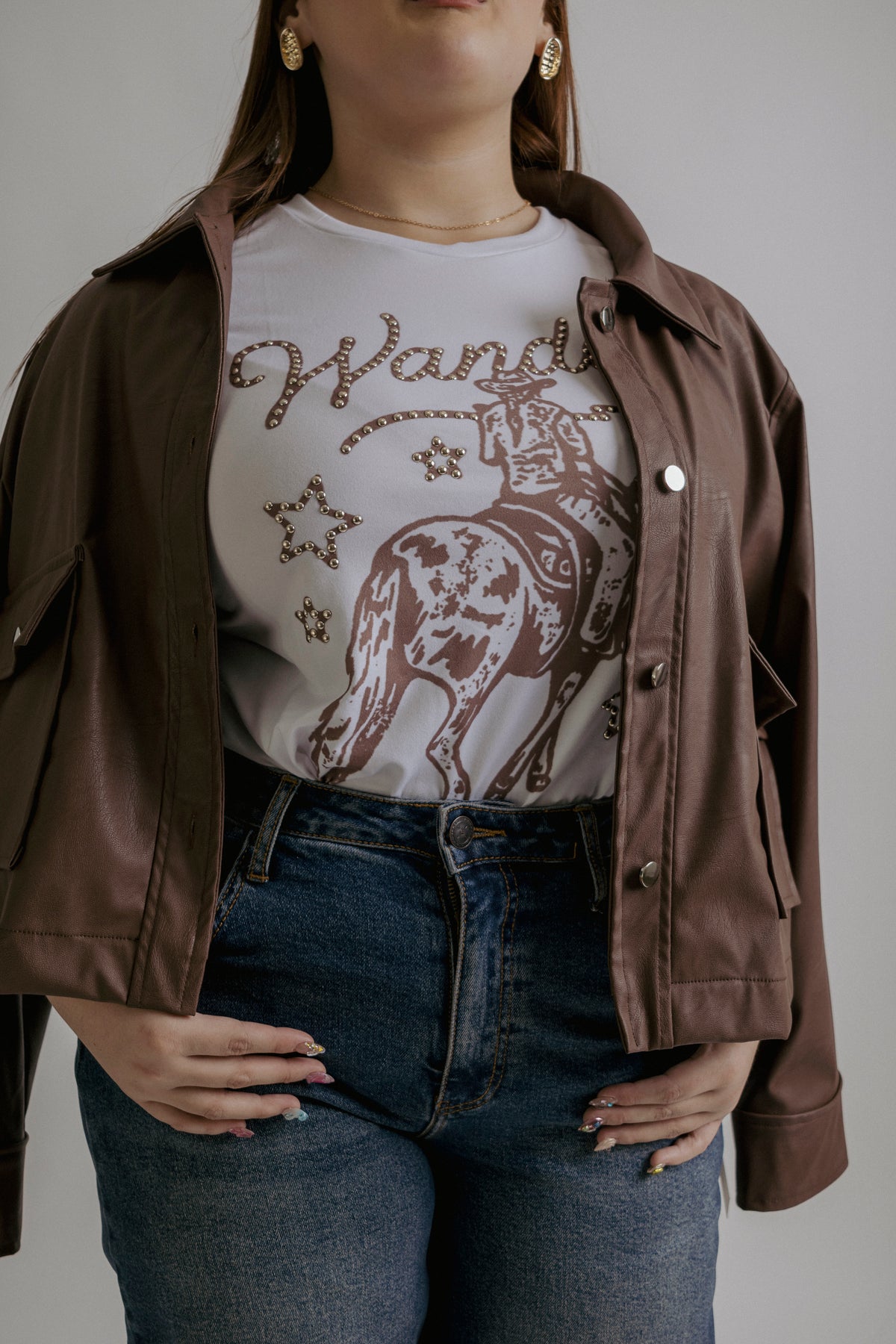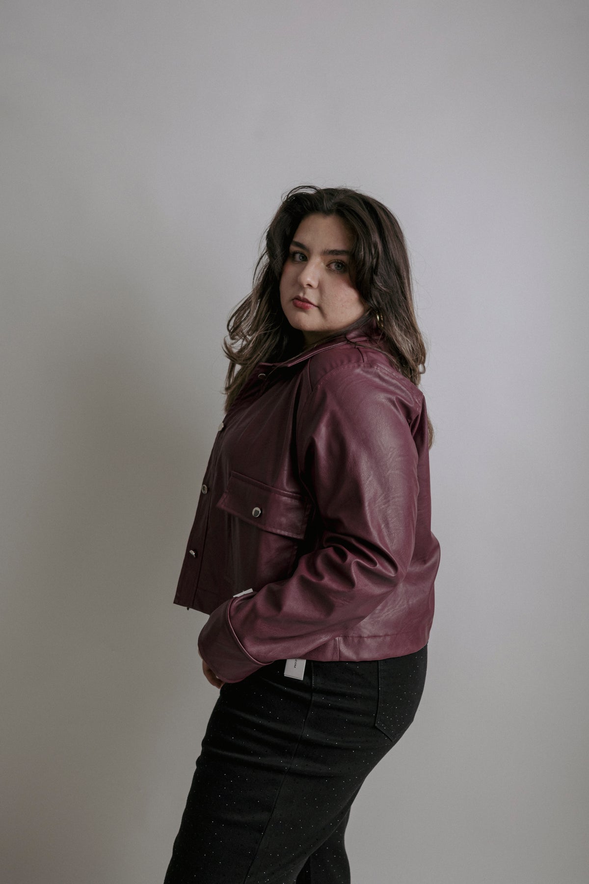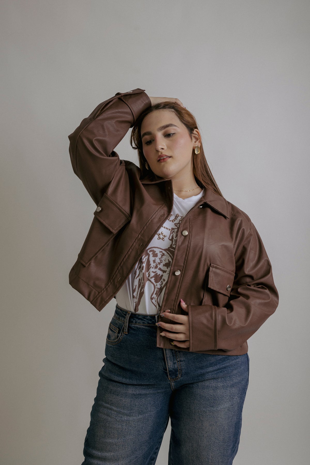 Chamarra en piel. Botones de metal al frente y en los puños color plata. Canesú al frente y en la espalda. Bolsillos frontales con solapa. Una prenda ideal para lucir unos SÚPER OUTFITS este otoño-invierno.