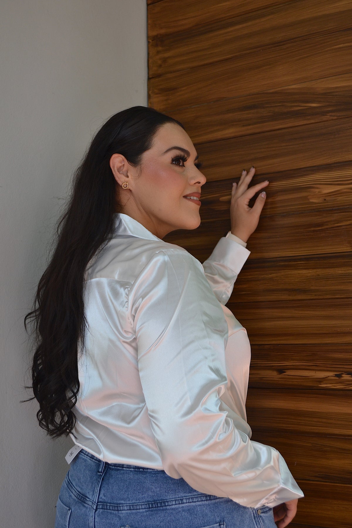 Blusa camisera de tela satin, modelo manga larga con botones forrados de misma tela, estilo camisa de botones. Ideal para usarse en conjunto con pantalón de vestir, en compañía de unos SÚPER JEANS o como sobre camisa.