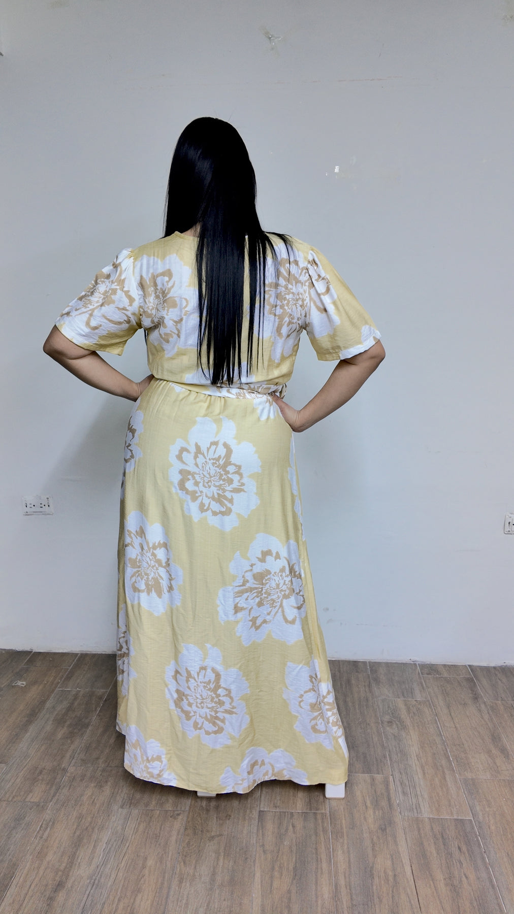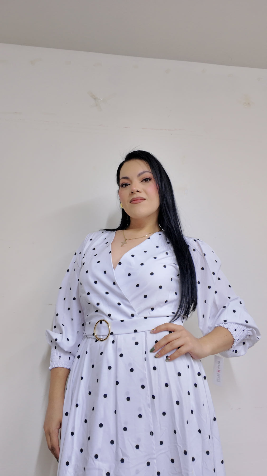 Modelo de vestido largo corto estilo volado, cuello redondo, con manga larga y diseño liso con laso de la misma tela, súper cool ideal para lucir un outfit PADRÍSIMO.
