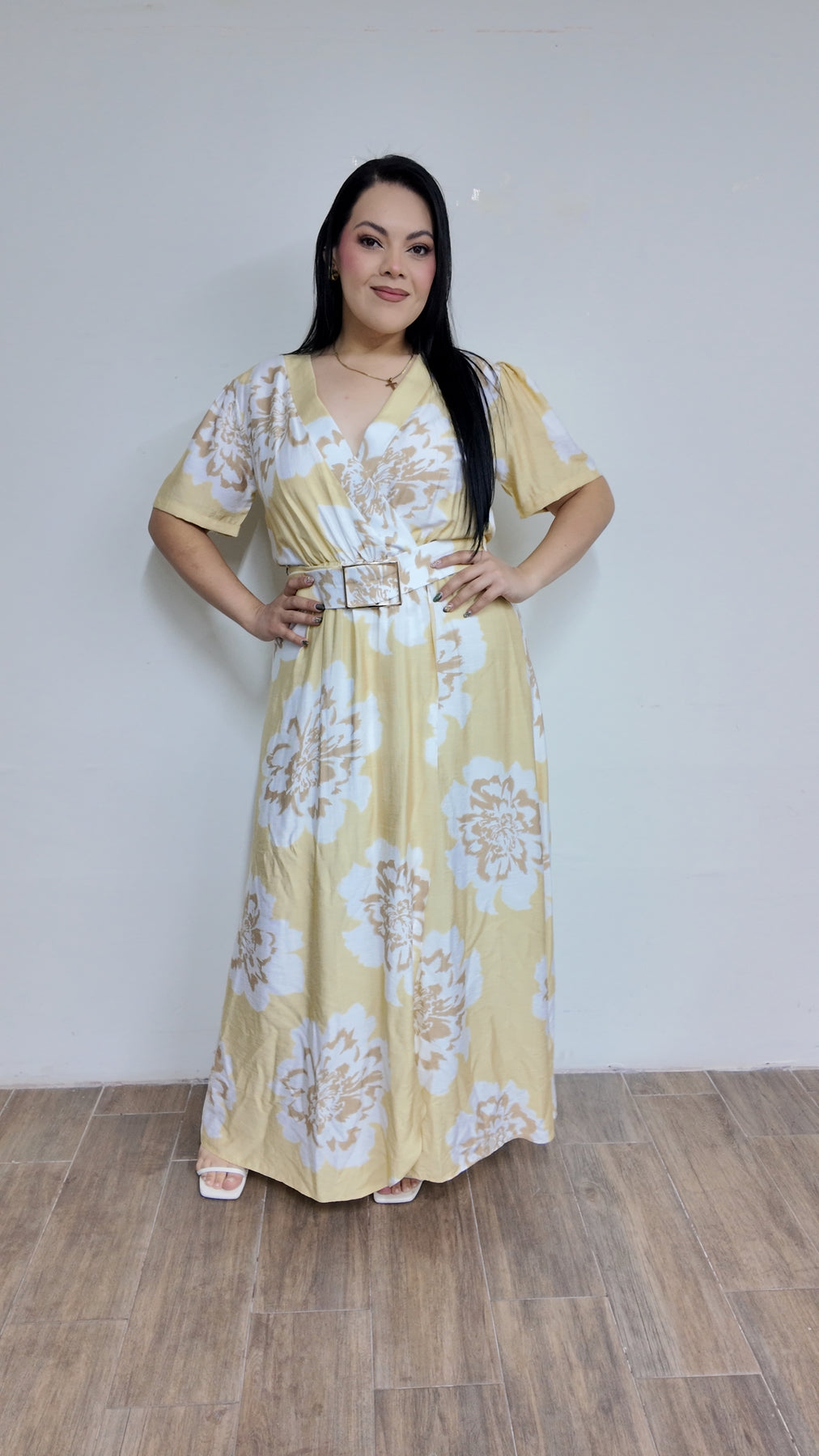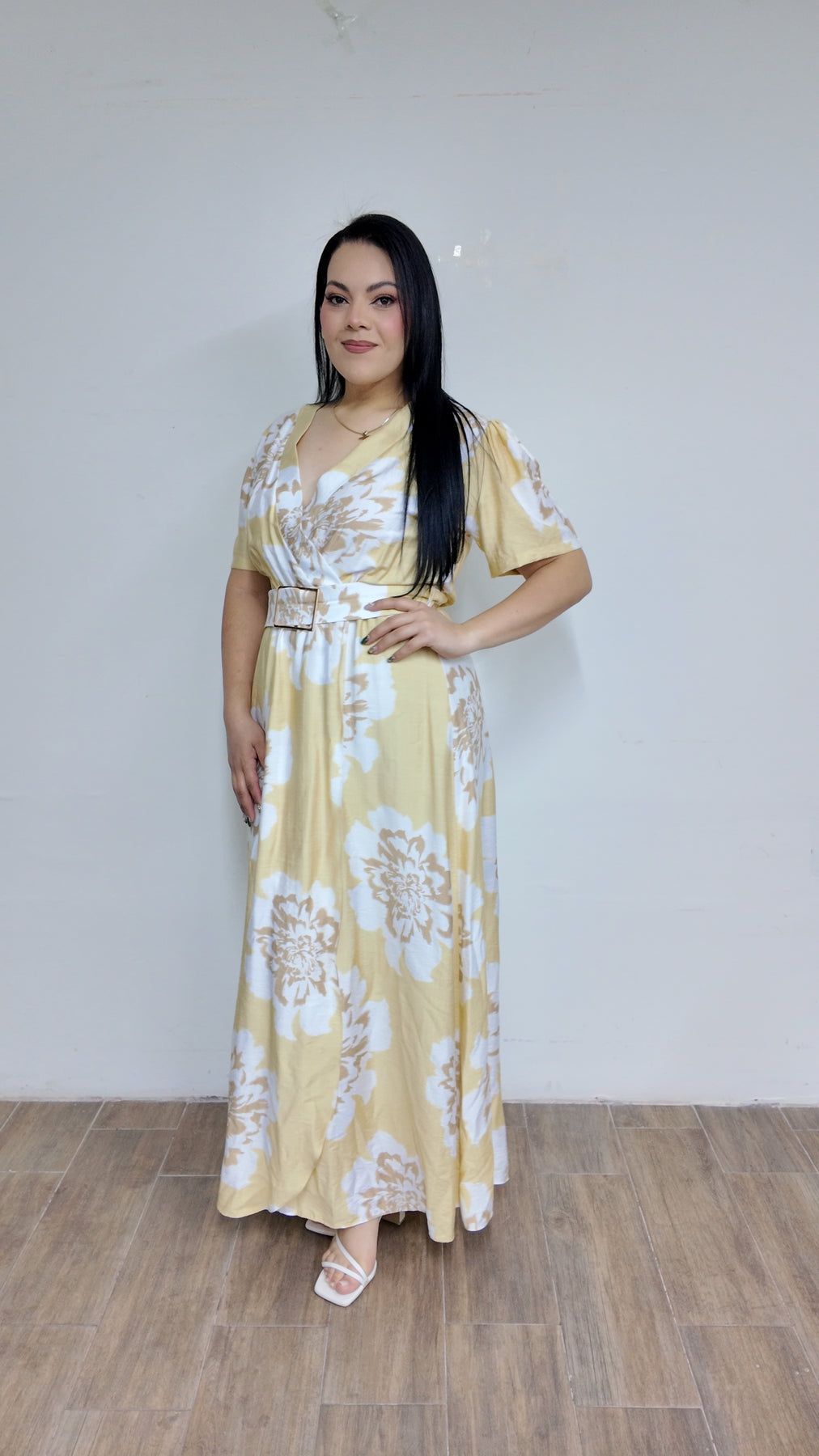 Vestido largo con olanes ,lindisimo con bolsas modelo manga 3/4, tipo abullonada modelo clásico. con cuello v y elastico en la parte de la cintura para lucir increíble